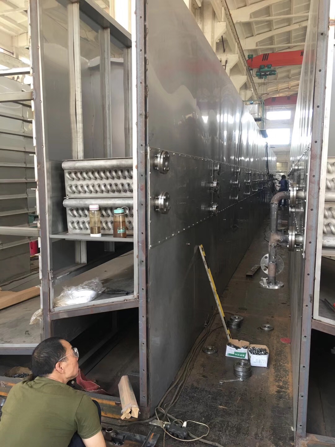 1、換熱器與網帶干燥室分開布置,在干燥室側面另設換熱器室,有效避免物料粉粒與換熱器的不良接觸(如粉粒料掉漏在換熱器上影響換熱效果等問題)。