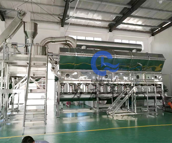 1. 干燥主機——結構形式:臥式多室流化床結構,帶冷卻段;材質:與物料接觸部分為SUS304不銹鋼,其余為碳鋼;床層結構:多孔板+風室,確保氣流分布均勻;干燥溫度:進風溫度120~160℃,出風溫度60~80℃;操作方式:連續(xù)進料、連續(xù)出料;密封結構:采用機械密封+氮氣保護(可選),防止粉塵外泄;清洗系統(tǒng):配置CIP在線清洗系統(tǒng),便于定期清洗,符合GMP標準;出料方式:底部螺旋出料或溢流口出料,確保出料順暢。