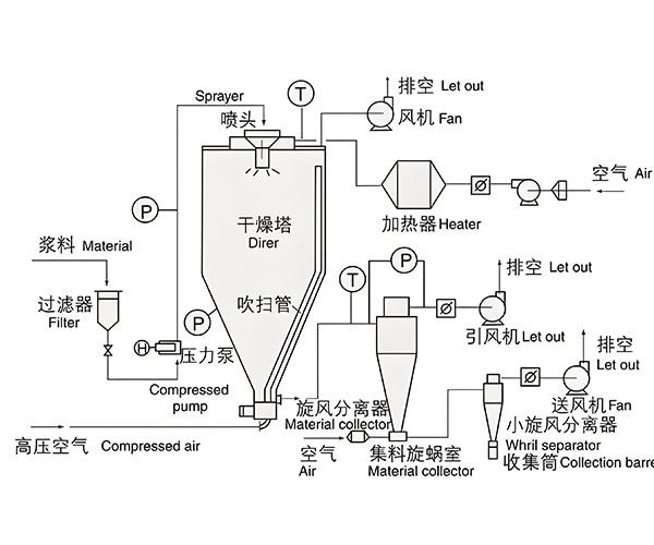 空氣通過加熱器加熱后,經送風機進入干燥塔頂部的熱風分配器,通過熱風分配器后,熱空氣均勻的進入干燥塔內,并呈螺旋狀運動。料泵同時將料液送至干燥塔頂部的離心噴霧器,料液被噴成極小的霧狀液滴。使料液和熱空氣接觸的表面積大大增加,水份迅速蒸發,在極短時間內干燥為干品。干品由旋風分離器與濕空氣分離,經旋風分離器底部的集料旋蝸室由干燥的空氣送至小旋風分離器分離,并收集在收料筒,尾氣經引風機排出。 干燥機的熱風系統、吹掃系統、風送系統均配有初效、中效、亞高效等過濾器,凡進入干燥系統的風都經過濾處理。凡與物料接觸部位均采用不銹鋼制作,符合GMP要求。