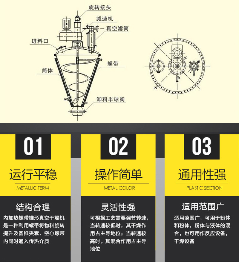 可以達到較高的混合精度。即使在同批產品中混合不同密度和不同顆粒形狀的物料,也可以在錐形混合機中達到所需的混合精度。在大批物料中添加很少量的物料這樣苛刻的工藝條件下,也可以在力度干燥生產的錐形螺帶真空混合/干燥機內^混合。